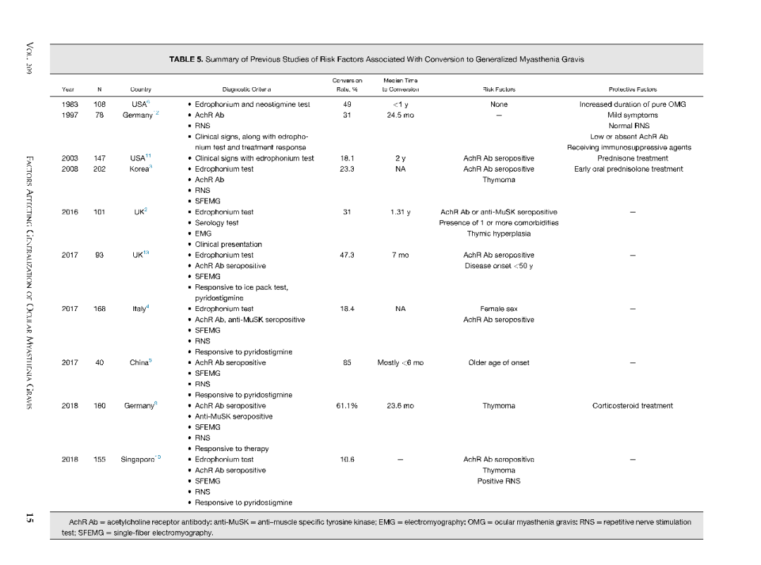 约30%-80%的眼肌型重症肌无力(Ocular myasthenia gravis,OMG)患者2年内转化为全身型重症肌无力(generalized myasthenia gravis GMG)。既往的研究结果显示转化的危险因素为:女性、发病年龄晚、乙酰胆碱受体抗体(AChR Ab)阳性、以及AChR Ab滴度高、合并有自身免疫性疾病、胸腺瘤、胸腺增生以及单一的眼部症状(如眼睑下垂或者复视),保护因素为OMG持续时间长。吸烟/戒烟在转化中具有争议。