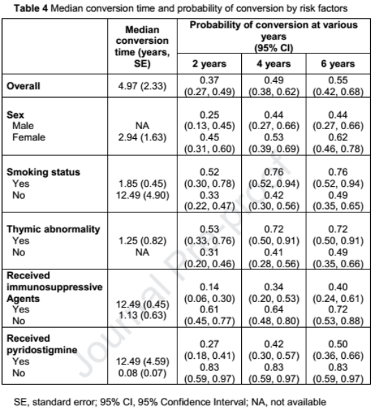 女性(OR = 2.15,95%CI = 0.81-5.67),吸烟史(OR = 2.64,95%CI = 0.81-8.62)和胸腺异常(OR = 3.82,95%CI = 1.20-12.18)与转化有关。转化前接受免疫抑制剂和溴吡斯的明转化风险低。接受免疫抑制剂和溴吡斯的明治疗的粗的OR值分别为0.47 (95% CI,0.14-1.59) 和0.23 (95% CI,0.04-1.53)。OMG发病年龄和合并自身免疫性疾病与转化为GMG无显著相关。