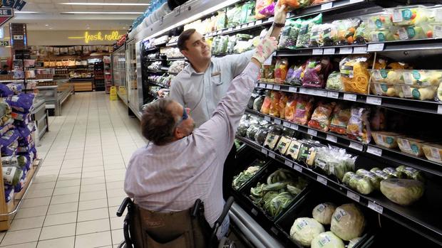 麸麦片在格子货架的高层,我默默地想着自己努力去够取一包的景象。15秒内一位售货员来帮我,另一位售货员帮我拿了一些酸奶,还为我指出了它的保质期。